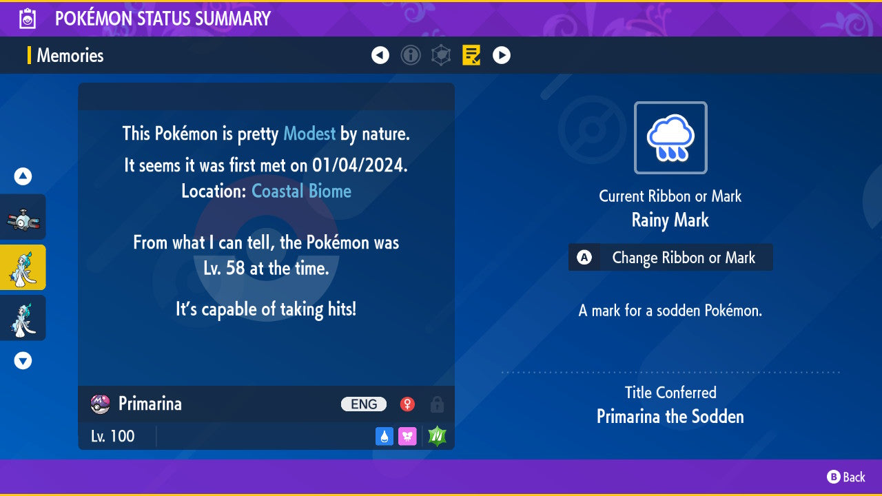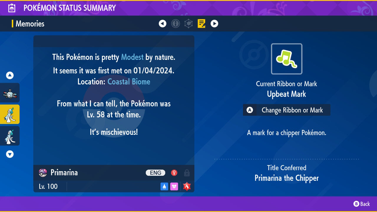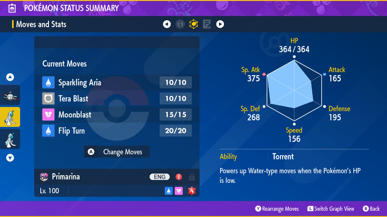Pokemon Scarlet and Violet Marked Shiny Primarina 6IV-EV Trained