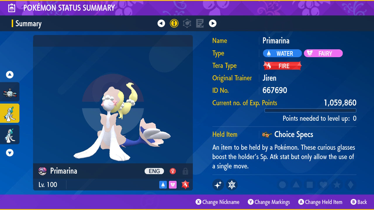 Shiny Primarina @ Choice Specs (Upbeat Mark) LV. 100